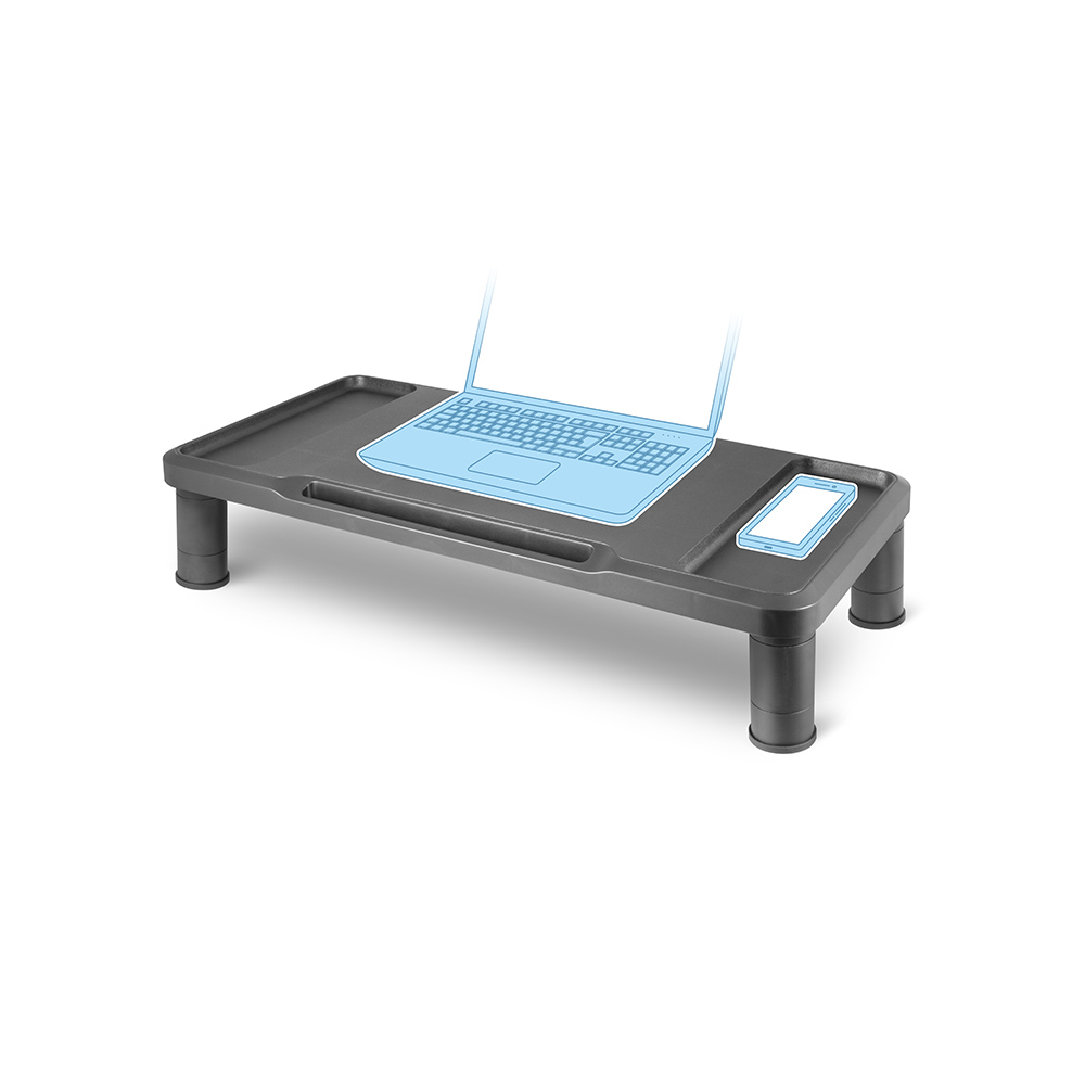 Plataforma com altura ajustável para monitor ou computador portátil. Com três níveis de ajuste em altura, dois compartimentos de arrumação e suporte para tablet ou smartphone. Offy Taka ajuda a manter uma postura correta e a secretária organizada.