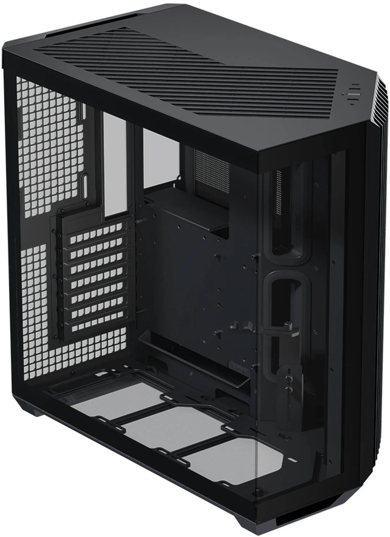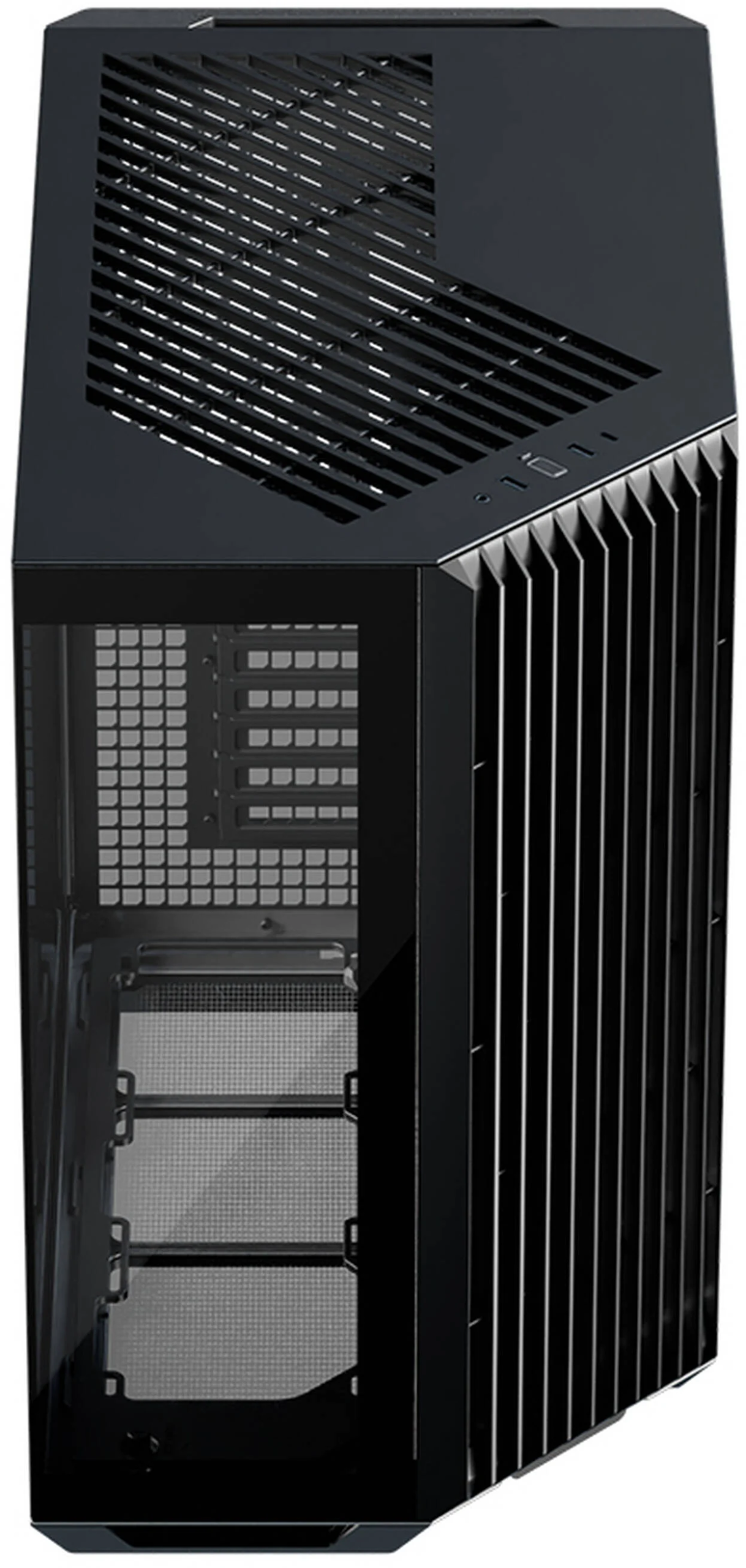 Os designs panorâmicos de câmara dupla padrão costumam colocar as ranhuras das ventoinhas laterais ao lado da motherboard, mas esta configuração não resulta num fluxo de ar eficiente através da caixa. Ao rodar o ângulo de entrada de ar de 90° para 45°, o design inovador melhora o fluxo de ar geral e a eficiência térmica, tanto para a GPU como para a CPU, mantendo ao mesmo tempo, a vista característica de uma caixa panorâmica.