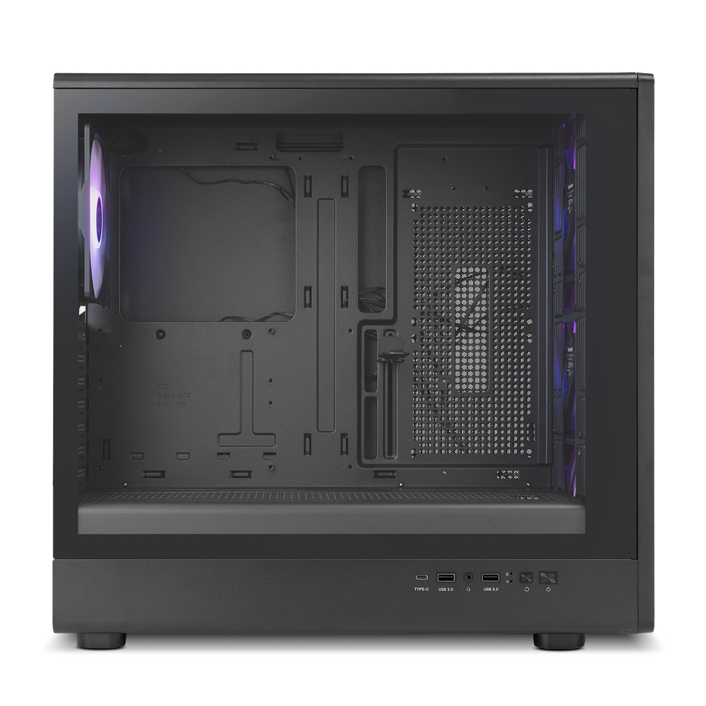 O frontal em metal mesh maximiza a entrada de ar, enquanto o painel lateral em vidro temperado permite uma visualização limpa e elegante do interior do sistema. Construída em aço SPCC de 0,5 mm, esta caixa oferece uma estrutura sólida, resistente e com acabamentos de elevada qualidade, reduzindo vibrações graças às bases em borracha.