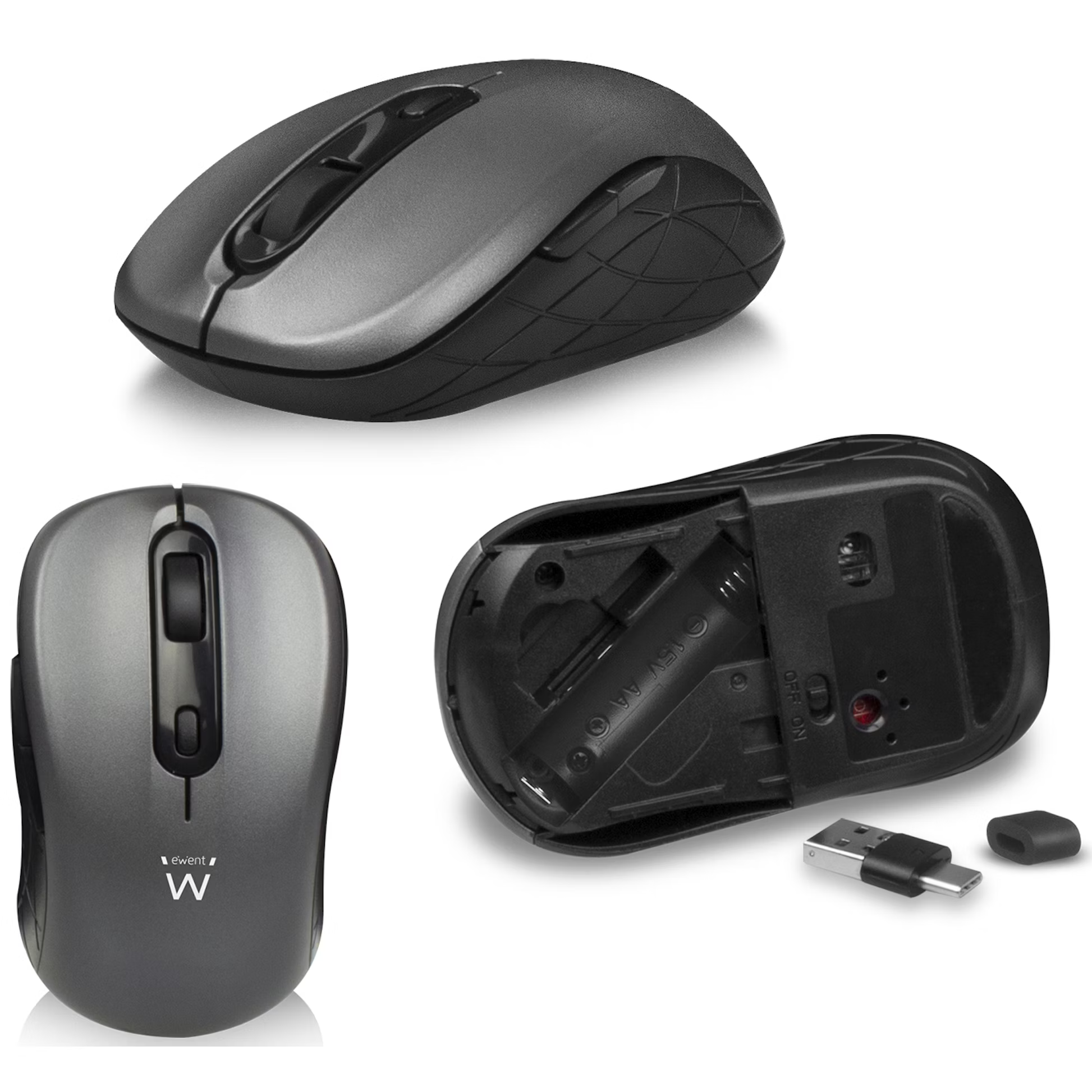 O rato sem fios incluído no conjunto tem uma resolução de 1600 DPI. Utilize o interruptor de PPP para alternar entre 800 – 1200 – 1600 DPI. Escolha a sensibilidade desejada para cada superfície. Além dos botões normais, o rato possui também botões de polegar. O recetor combinado pode ser armazenado num compartimento dedicado dentro do rato.